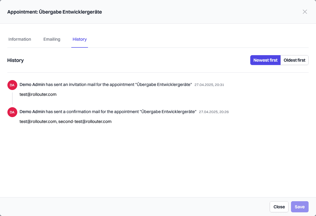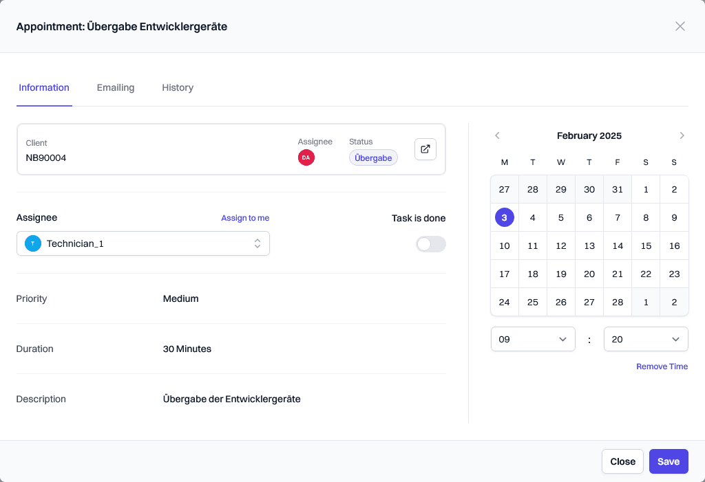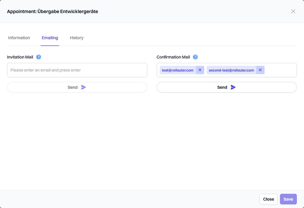 The emailing tab provides technicians the possibility to (re-)send invitation or confirmation emails for the given appointment.